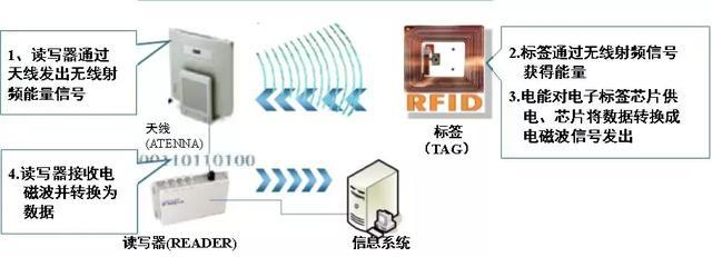 RFID的工作原理很簡單:標簽進入磁場后,讀寫器會感應到標簽信號,標簽通過無線射頻信號獲得能量(無源標簽或被動標簽)或標簽主動發送某一頻率的信號(有源標簽或主動標簽),然后解讀器讀取電磁波并轉化為數據,送至中央信息系統進行有關數據處理。